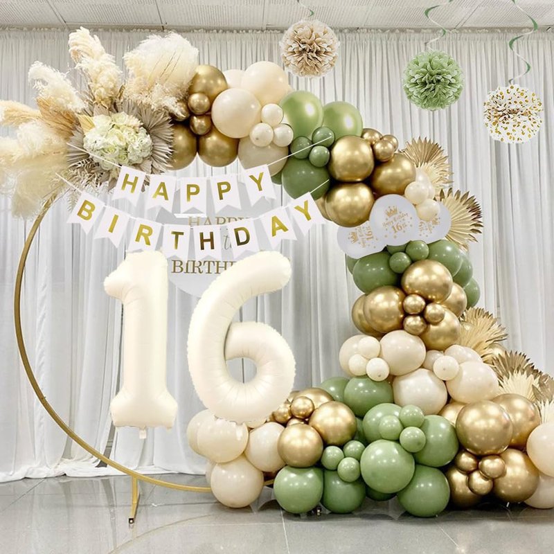 - SAGE GREEN 16TH BIRTHDAY DECORATIONS: Including 1 piece Happy Birthday Banner, 1+6 numeral balloons 32", 1 piece white gold 16th birthday sash 160*9.5cm, 1 piece gold birthday crown, 15 piece green balloons 10", 5 piece gold balloons 10", 5 piece sand white balloons 10", 5 piece white birthday pattern balloons 12", 3 piece metal green balloons 10", 3 piece gold confetti balloons 12", 3 piece white balloons, 1 piece of cake topper, 1 pieces 10m gold band, 16 foot balloon chain, 3 piece glue.