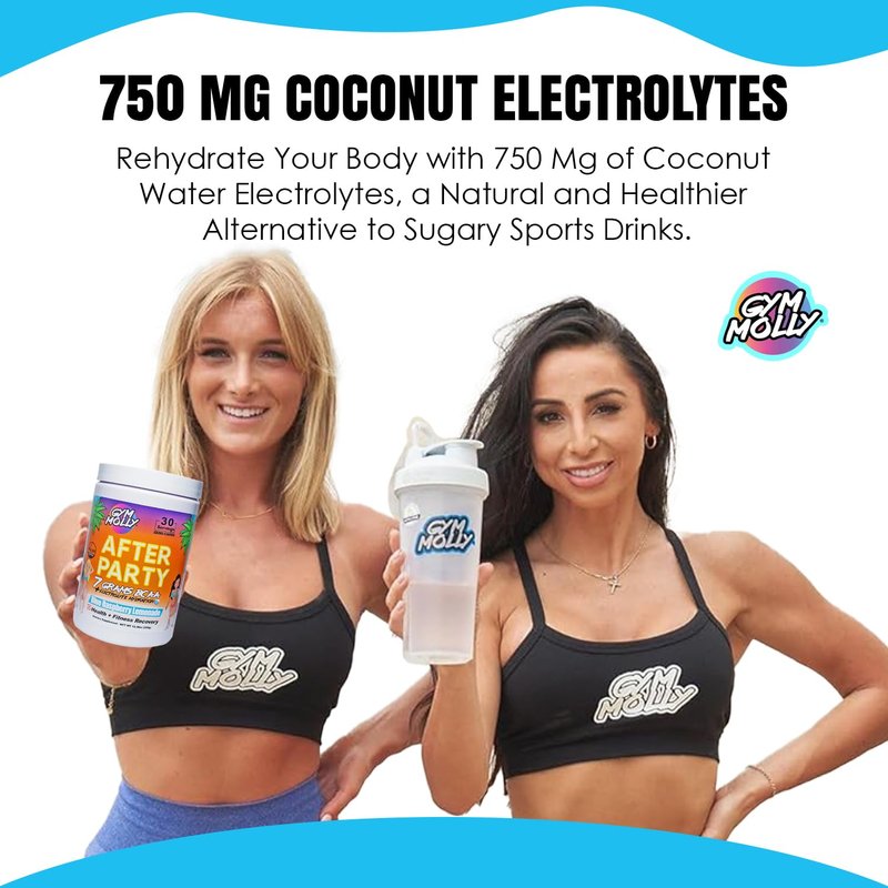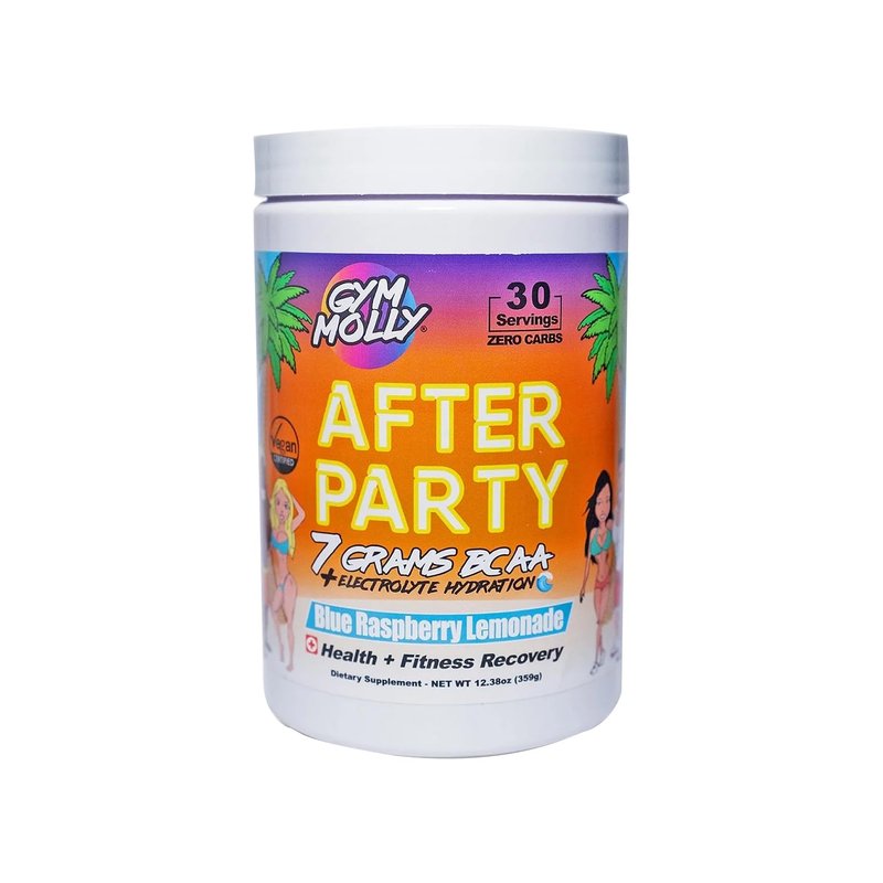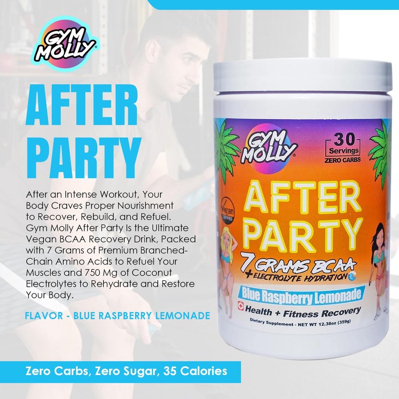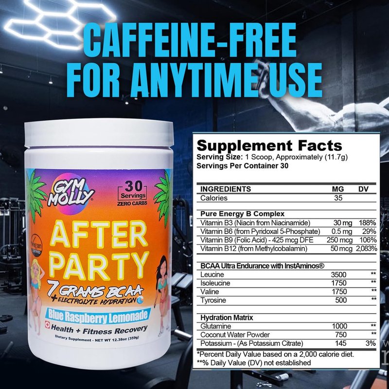 Gym Molly After Party Vegan BCAA Powder, Electrolyte Powder, BCAA Amino Acids After Post Workout Recovery Drink, Zero Carbs, Zero Sugar, 35 Calories Caffeine-Free (Blue Raspberry)