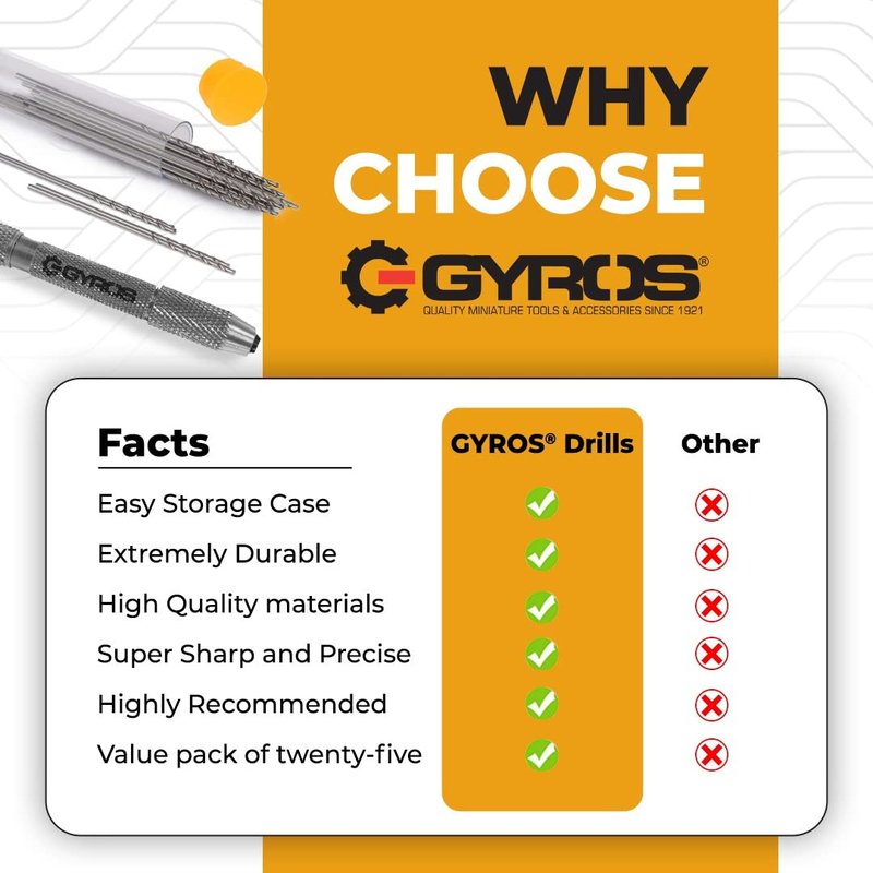 - Multiple Uses – For a better experience, Gyros Wire Gauge Micro Drill Bits can be utilized with a variety of hand and motorized tools. Straight Shank Mini Bits are compatible with a wide range of tool holding systems. To use with most power rotary tools, use with Gyros Mini Adaptor Chuck 45-01803. For all your hand drilling needs, pair with the Gyros Swivel Head Pin Vise 97-01818
