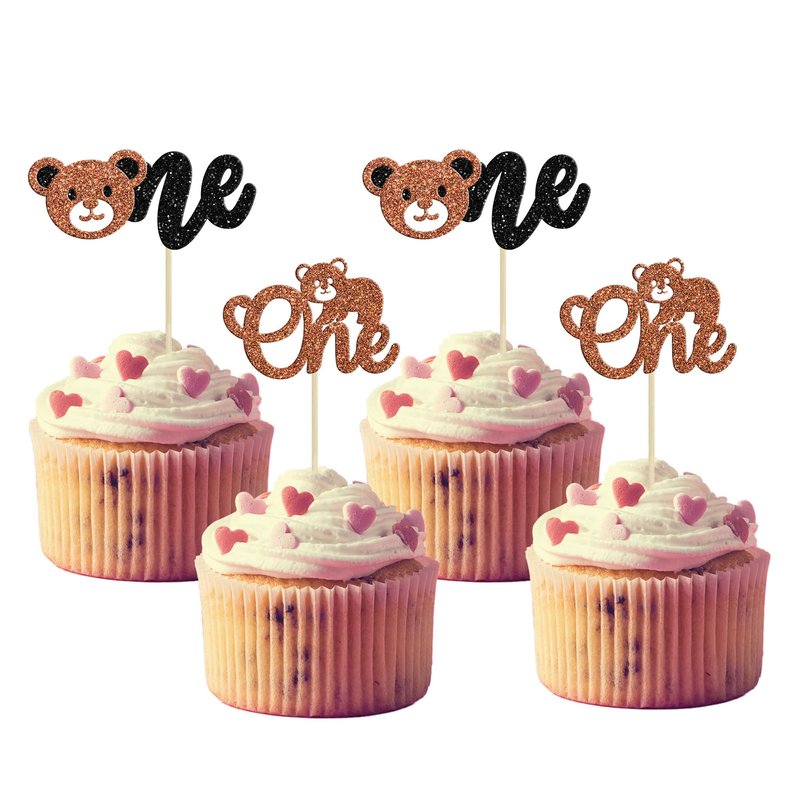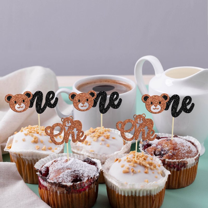Gyufise 24Pcs Bear Cupcake Toppers Glitter Bear One Cupcake Picks First Birthday Cake Decorations for Gender Reveal Bear Theme Baby Shower Kids Birthday Party Supplies