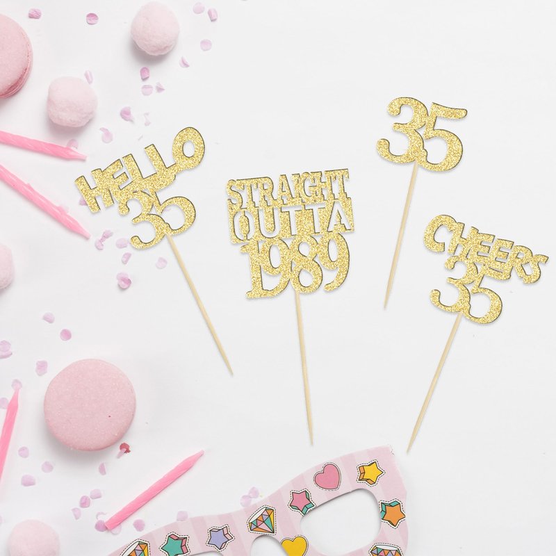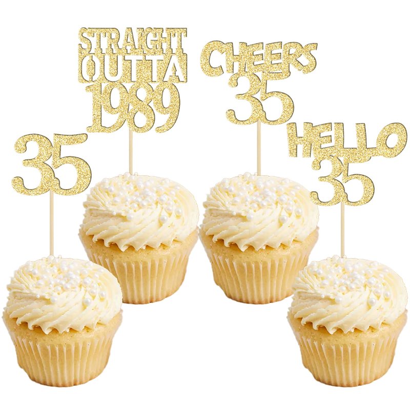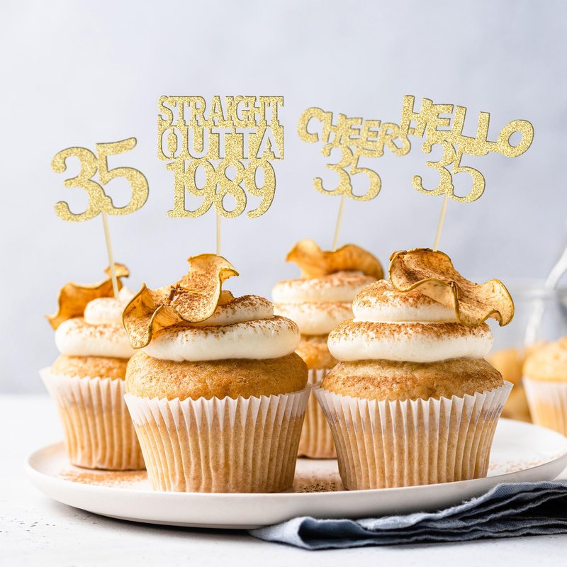 - 35th Birthday Cupcake Toppers are so cute and good for straight outta 1989 theme party, 35th birthday theme party, 35th wedding anniversary theme party cupcake decorations. They can make your cupcake more attractive and bring the fun to your party. You can also apply them for ice cream, fruits, cookies and other desserts.