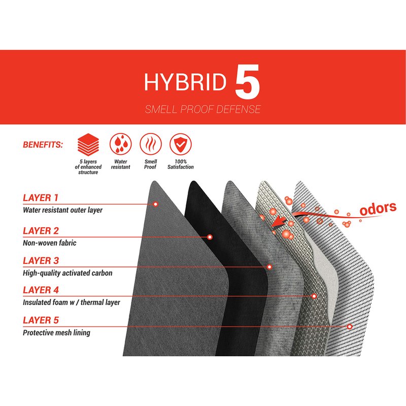 As you know, one of the toughest things about walking around with strong smells is keeping those smelly smells, under wraps. That’s why the Hybrid 5 Smell Proof Bag uses not one but FIVE LAYERS of protection to make everything inside 100% smell proof!