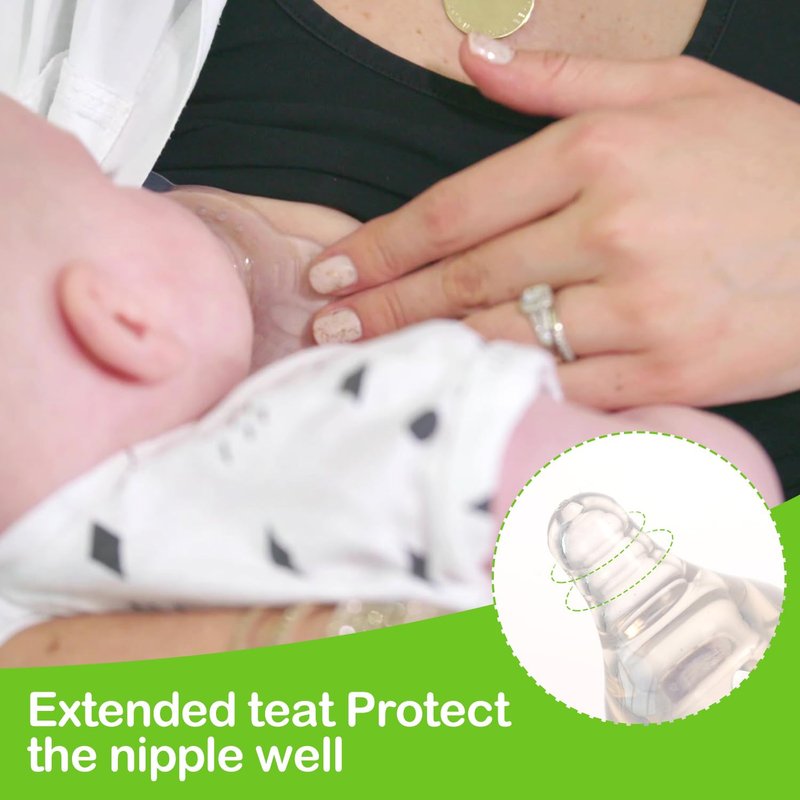 - BUTTERFLY BASE NIPPLE SHIELD - The extended teat design increases the distance between mum's nipple and the shield head, preventing the baby from biting the nipple. The variable flow teat helps prevent the baby from choking when milk flows too fast. The nipple teat mimics a baby bottle, aiding the transition from breastfeeding to bottle-feeding.
