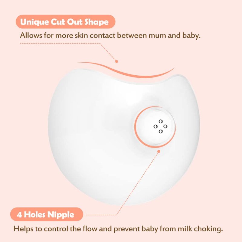 - [Especial Ergonomics Design] - The nipple shields for nursing is designed to be a unique cut out shape and super thin, which is flexible and more close to the breast, allowing more skin contact between mom and your baby. 4 holes nipple helps to prevent and control the flow from baby milk choking.
