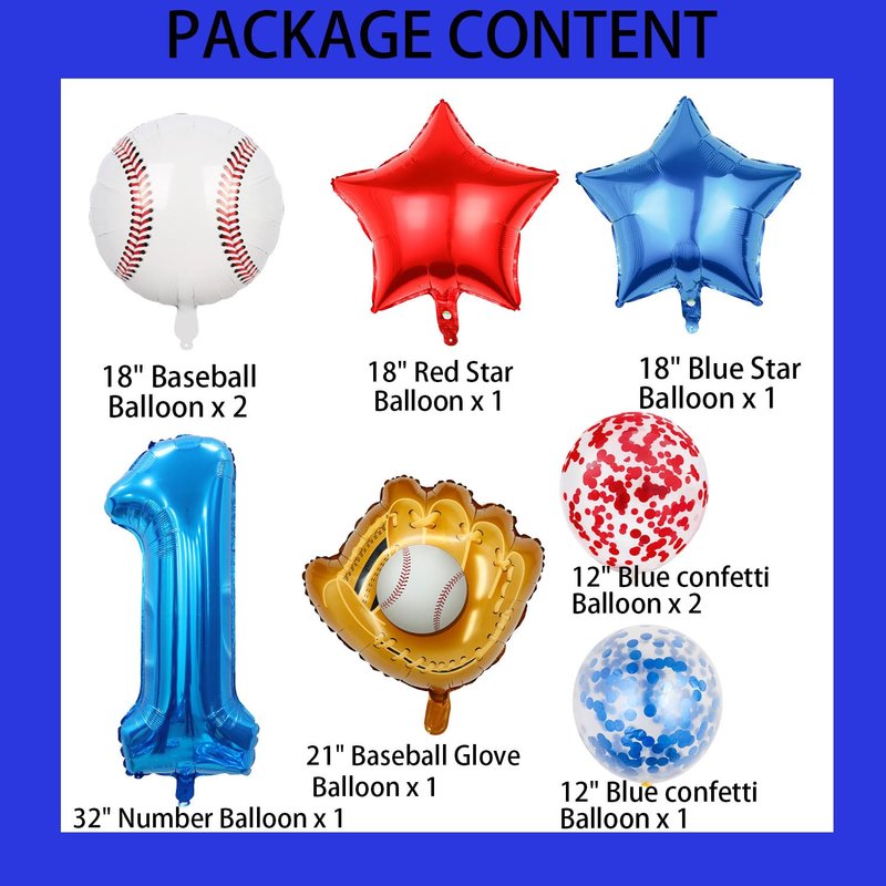 - 【What You Will Get】:Baseball Balloon Set - This valuable baseball party decoration kit includes 2pcs 18in baseball balloons,18in red star balloon 1pcs, 18in blue star balloon 1pcs, 2pcs 12in red confetti balloons,1pcs 12in blue confetti latex balloon, 1pcs 21in baseball glove balloon, 1pcs 32in blue number 1 balloon. Each package includes 9 balloons with 7 styles of patterns in total.