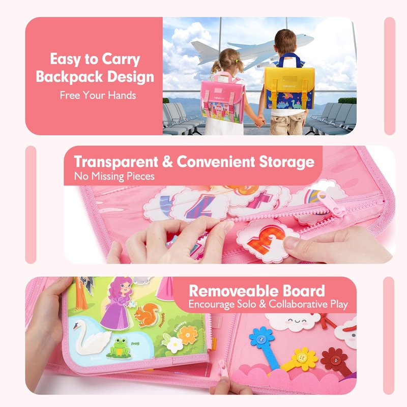 - Better Design & Safe Materials: Our commitment to safety and convenience shines through in this thoughtfully designed Busy Backpack. Our elaborate busy board is made of high quality felt fabric and double-sided velcro design, the fixture on the busy board is soft and sturdy, it's perfect for tiny hands aged 1-3. The adjustable strap ensures comfort on the go, while the transparent visual storage compartment encourages independence and responsibility in keeping track of play pieces. Plus, the zippered, removable inner panel offers versatile play options, solo or with friends