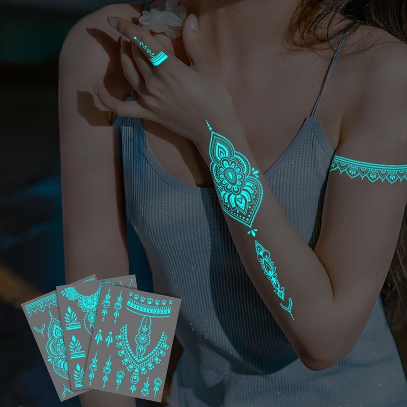 - Glow In The Dark: These henna temporary tattoo are perfect for everyone, offering a fun and safe way to express their creativity. With a variety of designs, including flowers, butterflies, heart, star, these waterproof tattoos are sure to be a hit at any party or event.