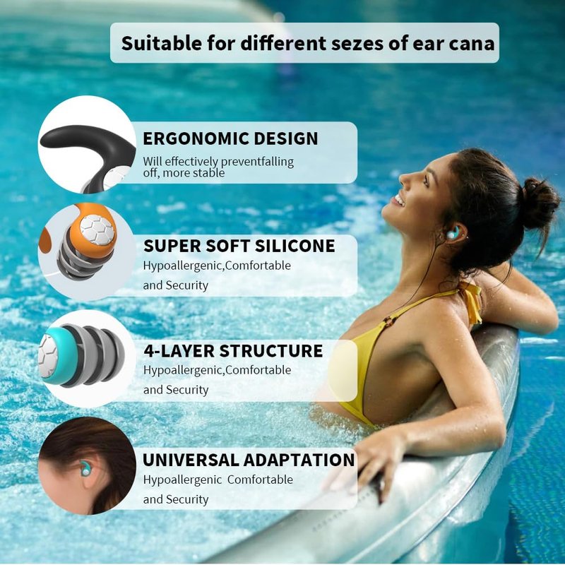 - ERGONOMIC DESIGN:The swimming earplugs are shaped to fit your ears, making them fit your ears tightly, and clip the end of the earplugs on your ears, making them not easy to fall off even when exercising. Perfect for showering, surfing, and kayaking, it's the perfect earplug for water sports enthusiasts