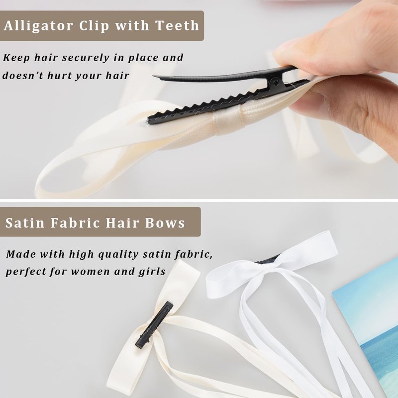 - Premium and Soft Bow Clips: Our bows barrette clips are handmade with satin fabric and metal alligator clip. Made with a full bodied fine silk ribbon and keep the perfect structure with satin finish. The bow measures approximately 7" by 4", and its tail are about 6" in length. Available in a variety of colors, so you can find the perfect one to match your style