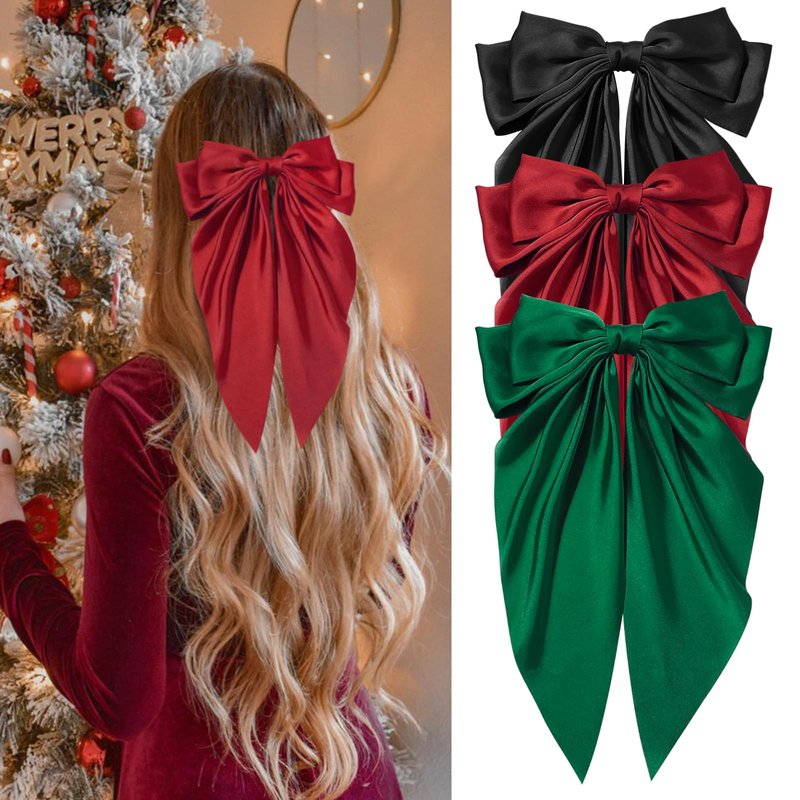 Hair Bows for Women Girls Silky Satin Big Bows Hair Barrettes Oversized Hair Accessories Long Tail Hair Ribbons -3Pcs -Black Red Green