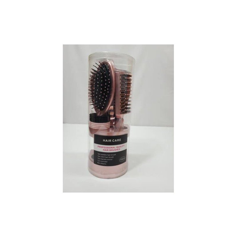 Upgrade your hair styling tools with the 12-Piece Hairbrush Set. This pink brush set has every tool you need to do your hair. The set includes an oval paddle brush, a roller brush, a hand mirror, a storage cylinder, and eight elastic hair ties. These brushes have firm, quality bristles that will not lose their shape. These bristles will glide through any hair type combing out tangles effortlessly. The different brushes will detangle your knots with ease, no matter your hair type.