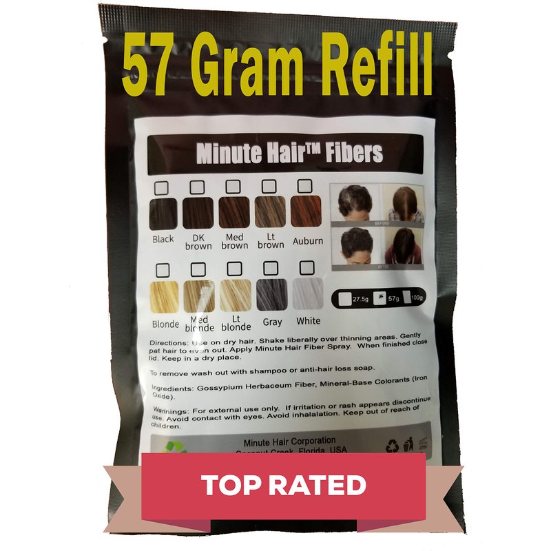 Use method: Make sure hair is dry and style your hair as usual. Follow the hair lines and start it from the back to the front. Shake or turn the bottle upside down and pat the side of the bottle with your fore finger so the fibers dispense onto your thinning areas. Block the forehead to avoid falling on the face. Gently pat the applied area to disperse the fibers and make it look natural. While you can shape your hair with a comb after the fibers are applied, try to keep a little distance from hair root to avoid contact with the fibers on your scalp as they can move and cause an undesired look. If the fibers move they can be restored by re-applying the fibers. Hair loss concealers are temporary. They last until you wash them out. Minute Hair fibers will not clog your pores or have any effect on natural hair growth. They are hypoallergenic. You can easily remove the fibers when you wash your hair or take a shower. The fibers are perspiration resistant and wind resistant when used with a strong hair spray to lock them to your hair and scalp. Hair spray is highly recommended. For best results use Minute Hair fiber hold spray. Available in 10 colors.