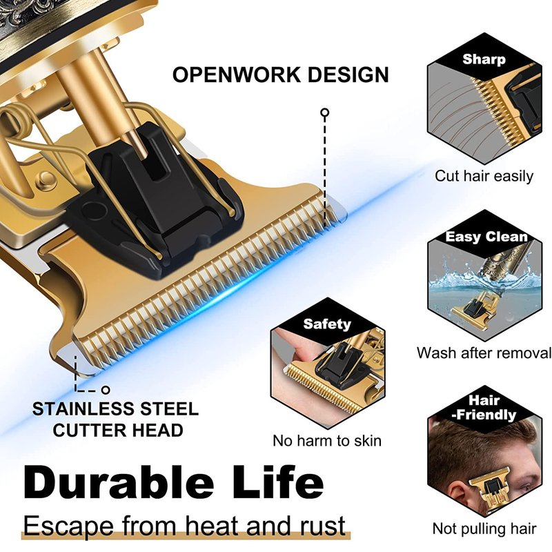 【T-BladeTrimmer Design】This hair trimmer adopts professional T-shaped blade design, and the fixed T-shaped blade can realize gradual hairstyle. Titanium, stainless steel, R-shaped design with sharp angle, does not burn the skin due to angle problems, sharp and wear-resistant.