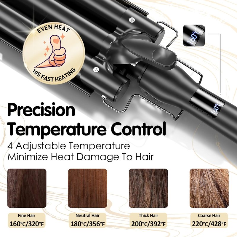 - [Heats Up Extra Fast & 4 Temperature Settings] The curling iron for hair could heat up in 30 seconds. And it has an adjustable temperature range from 320°F to 450°F, which suit all hair textures. 160℃/320℉ - suitable for fine hair; 180℃/356℉ - suitable for normal hair; 200℃/392℉ - suitable for thick hair; 220℃/428℉ - suitable for coarse hair.