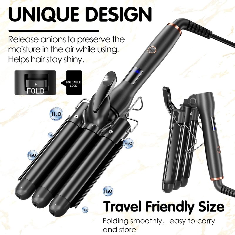 - [Foldable & Portable] Our foldable triple barrel hair waver curler saves more time than a single-barrel curling iron to create mermaid waves or glamorous waves. Saves more space to carry and store than ordinary three barrel curling irons, includes curling wand storage bag and power cord storage strap make storage easier. Wide voltage (110V-240V) design, is suitable for travel everywhere.