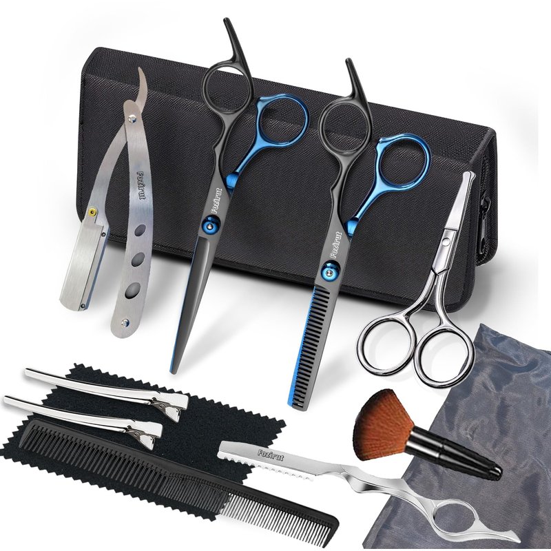 - ✂️🪒: ALL-IN-ONE HAIR CUTTING TOOLS: 1 x Hair Scissors,1 x Thinning Shears, 1 x Small Facial Hair Shears (for eyebrow, nose hair), 1 x Hair Texturizing Cutting Razor, 1 x Straight Edge Razor (Blade Included), 1 x Cleaning Cloth, 1 x Comb, 2 x Hairpin, 1 x Neck Duster Brush, 1 x Leather Bag. The hair cutting kit meets all your hair cutting and styling needs.