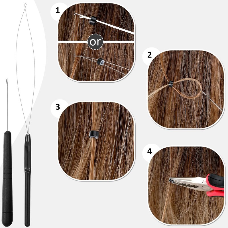 - Complete accessories: you will receive a hair extension tools kit that includes: 2500 micro silicone link ring beads (500 each in black, brown, dark brown, light brown and blonde), 1 plier, 1 threader, 1 crochet hook, 10 curved hair needles, 5 metal hair clips, 1 comb, 5 rolls sewing threads, 500 colorful rubber bands and 500 black rubber bands. The hair extension kit is enough to meet your needs.