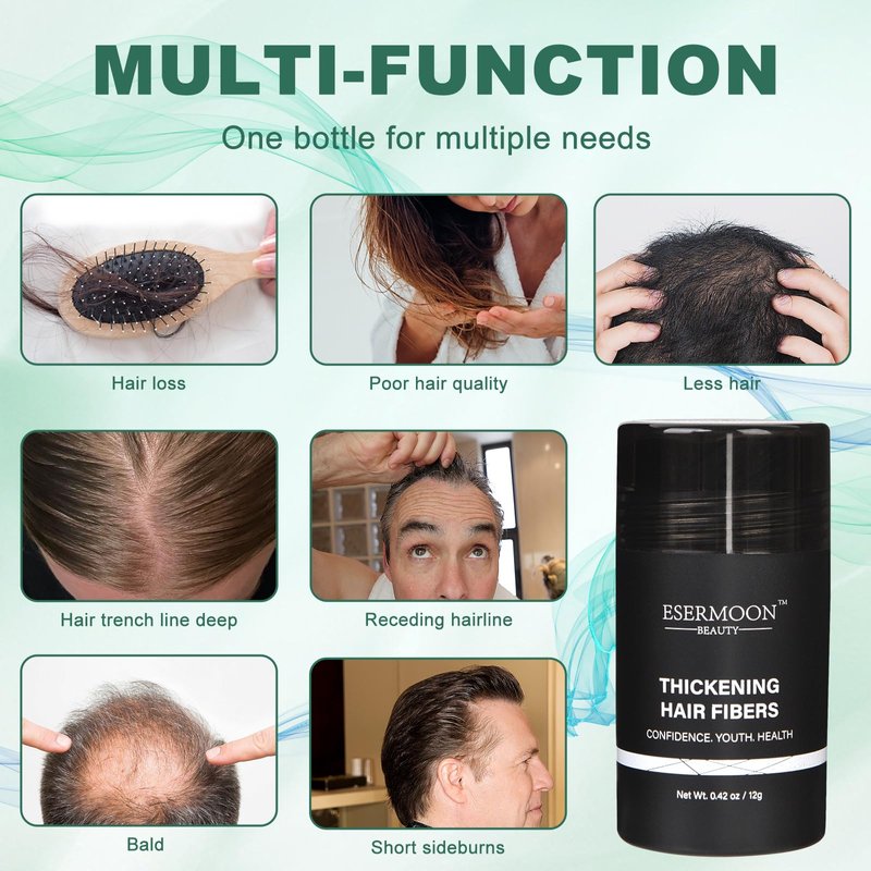 - ➤【SAFE FORMULA】-Crafted from plant fiber and 100% natural keratin, ESERMOON hair-increasing fiber is designed to be gentle on the scalp, avoiding pore clogging and ensuring a healthy application.