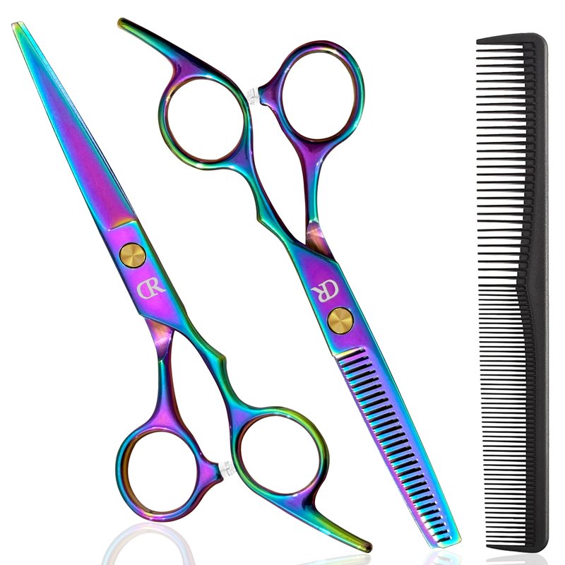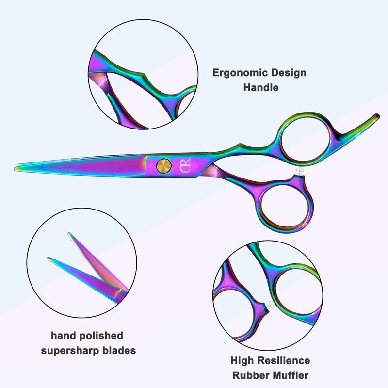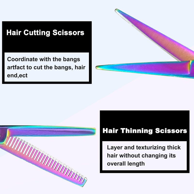 Elevate your hairstyling skills with this vibrant and eye-catching professional haircutting kit. The set includes a pair of precision scissors with ultra-sharp, durable stainless steel blades that effortlessly slice through hair. The ergonomic handles, adorned with a mesmerizing iridescent finish, provide a comfortable and secure grip for precise control. Complementing the scissors are combs to detangle, section, and shape your clients' hair. This comprehensive kit is a must-have for professional stylists and home users alike, offering both functionality and flair to create stunning hairstyles with ease.