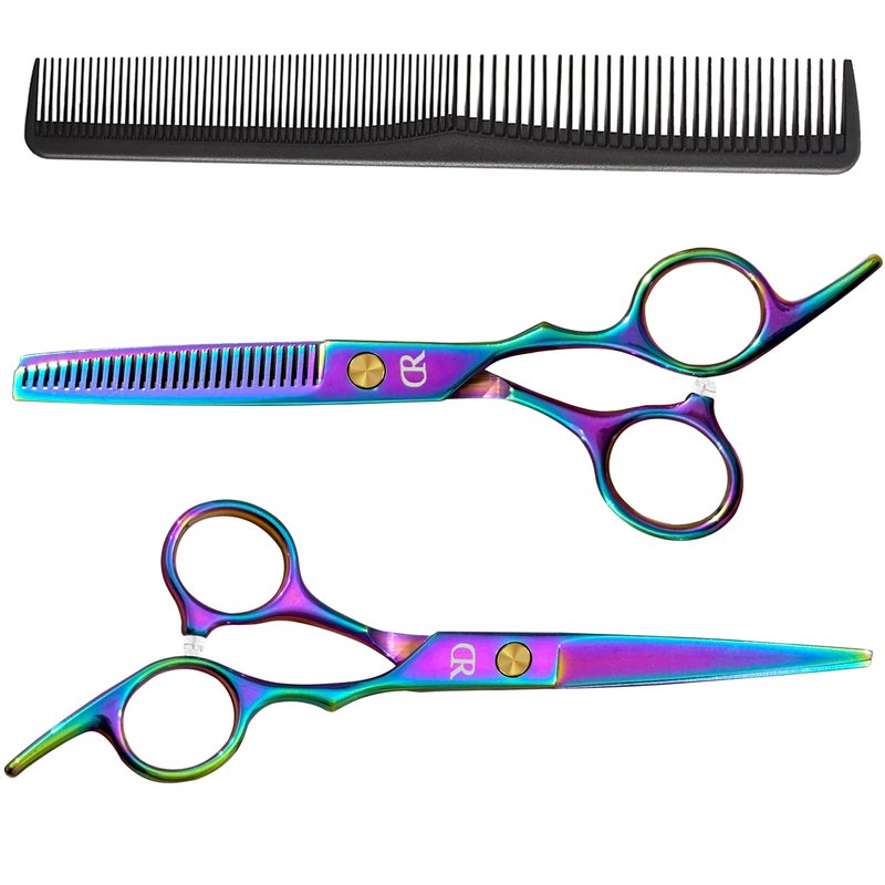 Elevate your hairstyling skills with this vibrant and eye-catching professional haircutting kit. The set includes a pair of precision scissors with ultra-sharp, durable stainless steel blades that effortlessly slice through hair. The ergonomic handles, adorned with a mesmerizing iridescent finish, provide a comfortable and secure grip for precise control. Complementing the scissors are combs to detangle, section, and shape your clients' hair. This comprehensive kit is a must-have for professional stylists and home users alike, offering both functionality and flair to create stunning hairstyles with ease.