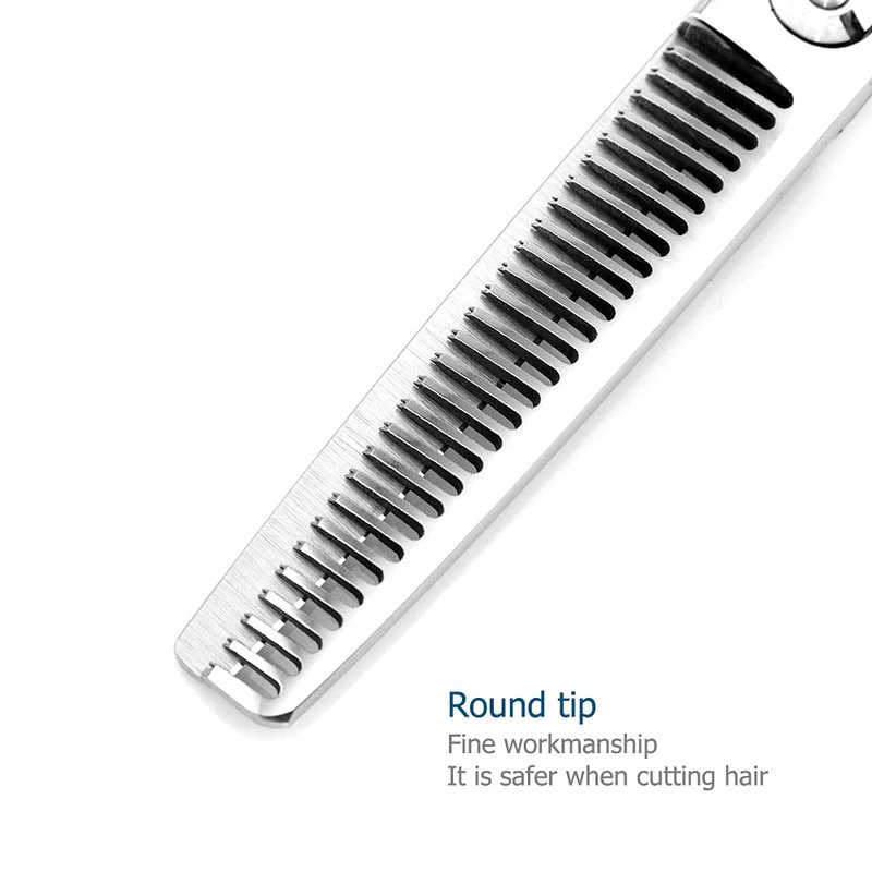Professional hair thinning shear 5.5 INCH with precise tension screw,convex edge. Good hand feeling,very sharp Material: SUS440C Hardness: 58-60HRC Thinning rate: 20%-25% Sharpness level: 5stars Overal Length: 6.57 INCH Blade Length: 2.17 INCH Net weight: 1.91 oz