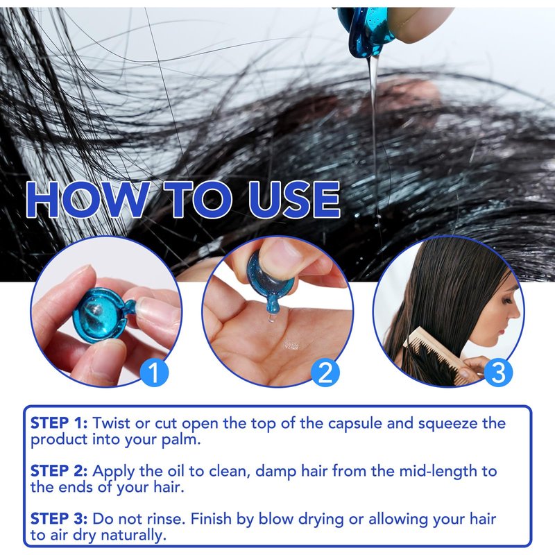 - HOW TO USE: Start by twisting or cutting the capsule neck with scissors, squeeze the product into the palm of your hand and spread evenly. Then apply the hair oil to clean, damp hair and gently comb through. No rinsing is required! Blow dry and style hair as usual.