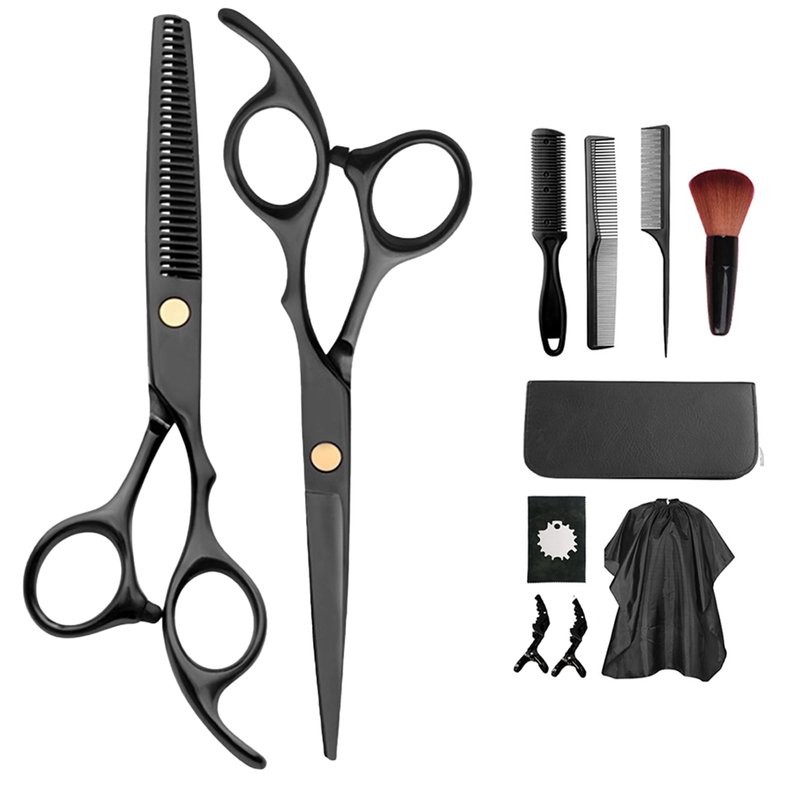 Haircut Scissors Sets - 11 Pcs Black Stainless Steel Haircut Set with Thinning Scissors, Neck Duster Brush, Comb, Barber Cape, Hair Clips with Pu Box