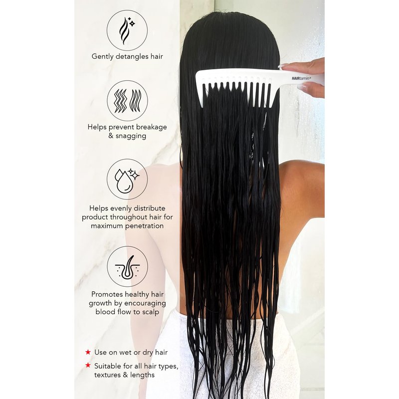 - Precision Redefined - HAIRtamin’s detangler comb is more than just a comb; it's precision instrument for your hair. Its wide-tooth design, crafted with utmost care, ensures gentle yet effective detangling of both wet and dry hair. No more painful tugging or snagging – with this detangler, you'll experience smooth, effortless strokes that leave your hair tangle-free and beautifully managed.