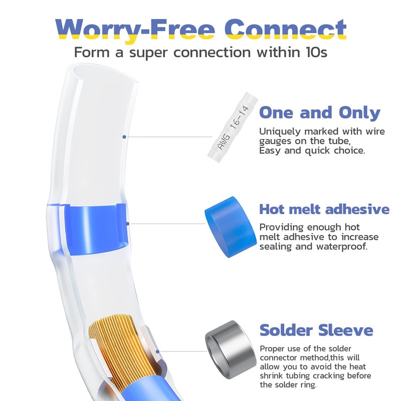 The features of the Haisstronica solder seal connector include: 1. Weatherproof solutions. 2. Premium solder seal ring. 3. Abrasion resistance and environmental protection heat shrinkable tube. 4. All-in-one step:easy to use with a heat gun,perfect for both DIY projects and professional use. 5. Wide Applications:120PCS Solder Seal Wire Connectors Includes White AWG26-24 25pcs/Red AWG22-18 45pcs/Blue AWG16-14 40pcs/Yellow AWG12-10 10pcs,thus can be widely used in automotive, motorcycle,and marine. Overall, Haisstronica solder connectors offer a reliable, easy-to-use, and versatile solution for electrical connections, making them a popular choice for both professionals and DIY enthusiasts alike.