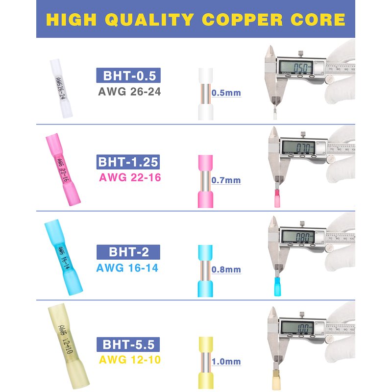 - ✔ HIGH QUAILTY COPPER CORE: Core Heat shrink butt connectors use the copper core with high thickness, which is up to 0. 7mm. Make connection project safer! High thickness copper core calls the attention of buyers!