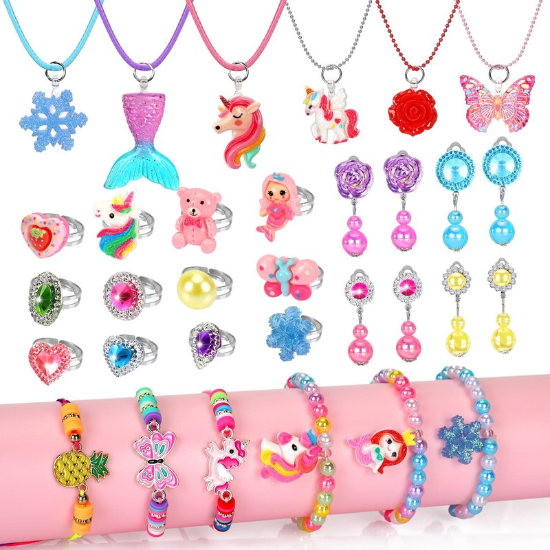- Lovely Girl Toys: Our kids jewelry for girls is a complete set that includes 12 delightful toddler rings, 6 stylish little girl necklace, 6 stylish bracelets, and 4 pairs of adorable earrings. A total of 28 pieces of jewelry set are designed with colorful and playful themes that girls will love. Unicorn toys for girls age 4-6 are sweet, lively, and suitable for different outfits, also fun to share with friends. Perfect girl toys for imaginative play and dress-up games