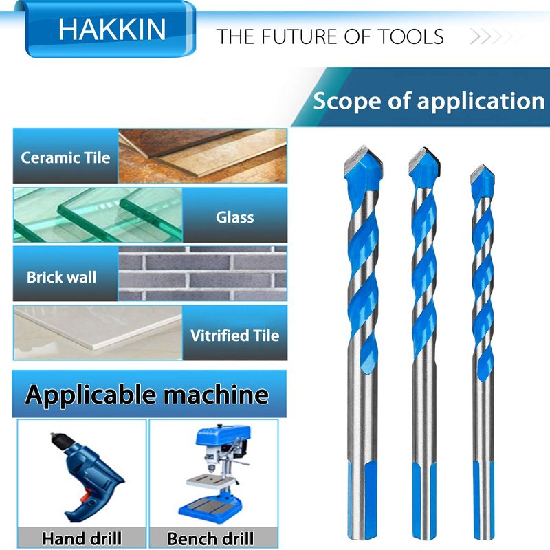 Blue Masonry Drill Bit Specification Color : Blue & silver Material : YG6X Carbide Tip Package included : 12 pcs,2 Pcs x 3mm, 2 Pcs x 4mm, 2 Pcs x 5mm, 2 Pcs x 6mm,1 Pcs x 7mm, 1 Pcs x 8mm, 1 Pcs x 10mm,1 Pcs x 12mm with Storage box Product Feature : The surface of the drill bit is made of hard alloy and rust-proof material, so it has a longer service life, Plus higher hardness and more wear-resistant than ordinary drills. The shape of the product is designed to efficiently remove chips, speed up the drilling, and efficiently complete the task.and 3-flats shank allows drill bit easy plug and to be held tightly. The multi-material drill bit can be used for glass, ceramic tile, cement wall, plastic iron, wood, etc. When drilling hard materials (glass, tile, marble or granite), please lubricate with water. How to Install Multi Material Drill Bit: Step One -- Unscrew the drill chuck and put the triangular handle into the drill bit. Step Two -- Tighten the triangle drill with a tightener and install the multi material drill bit. Step Three -- when drilling holes in high hardness materials.Use WATER for lubrication. Step Four -- Try to keep the drill vertical when drilling. Note : Universal handle for electric drills and bench drills, but NOT fit for impact drills. Keep the product out of the reach of children to avoid accidental injury.