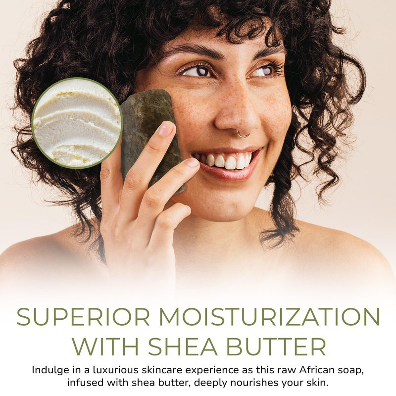 - Superior Moisturization with Shea Butter - Indulge in a luxurious skincare experience as this raw African soap, infused with shea butter, deeply nourishes your skin. The shea butter in our raw African black soap contains natural richness that enhances moisture retention, leaving your skin irresistibly soft and hydrated.
