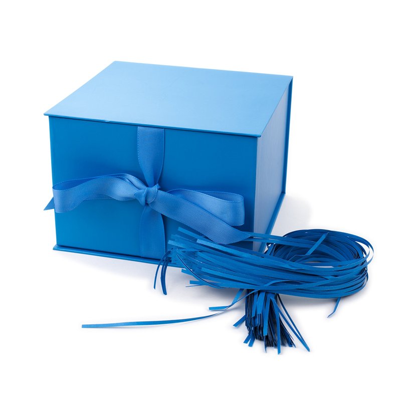 - SIMPLE DESIGN: Impress any gift recipient with this solid blue gift box, complete with a matching ribbon to tie the box closed and red shredded paper on the inside.