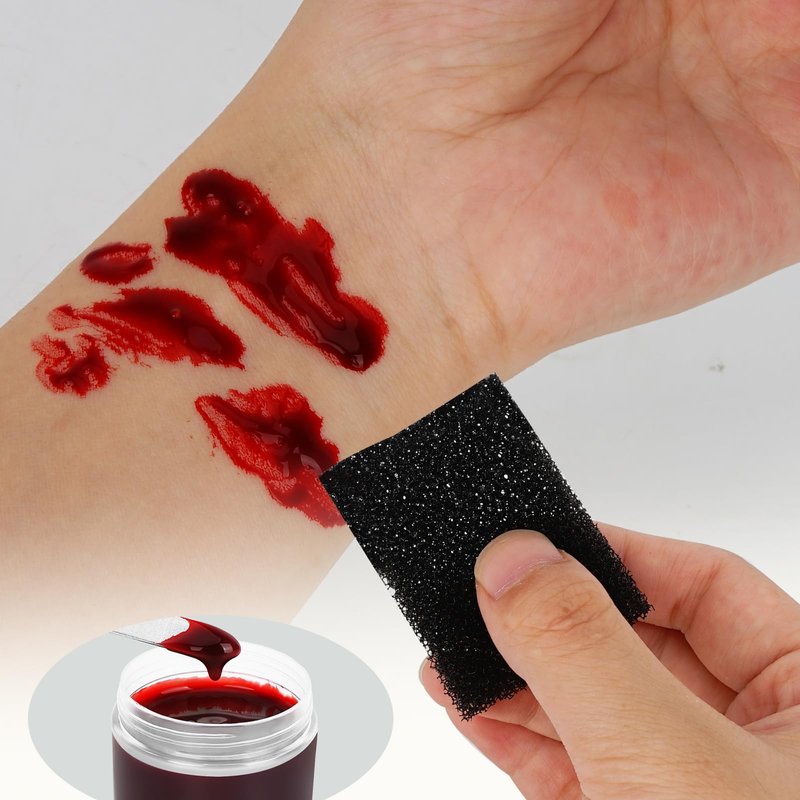 Realistic Fake Blood Easily manipulated to form cuts and other molded shapes. Perfect for hyperrealistic wound FX,big wounds,small cut,slit throat,realistic slit-wrist blood,gashes Not include the Spatula tool Stipple Sponge Use it to match the fake blood gel or paint oil, you can make different realistic wound effects, such as scratches, splashes Coagulated Blood Gel Ingredients: Water,CMC,Carmine,Citric Acid,Potassium Sorbate Sealing design, Prevent fake blood flowing out.