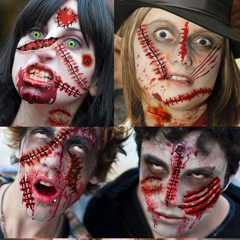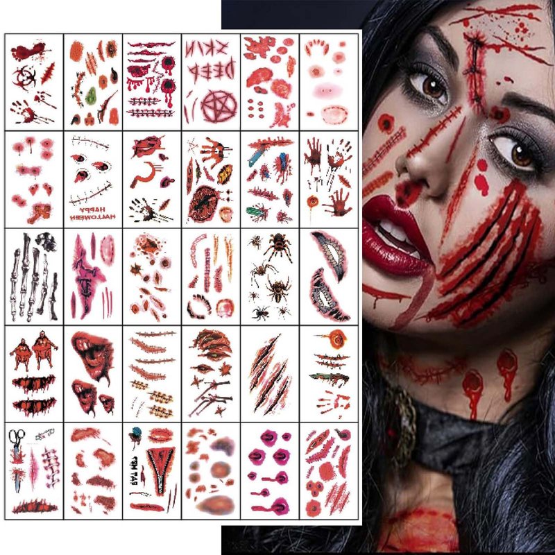 - Rrealistic Zombie Tattoo Kit:Come with 30 sheets Halloween scar tattoos. The 3D design and clear ink makes scar wounds look more realistic and natural, present a more shocking and realistic effect and giving you a better dress up experience. The patterns like big bloody wound, bite mark, cut, scar, stitches, scratch, and so on! Unforgettable Halloween experience start with it