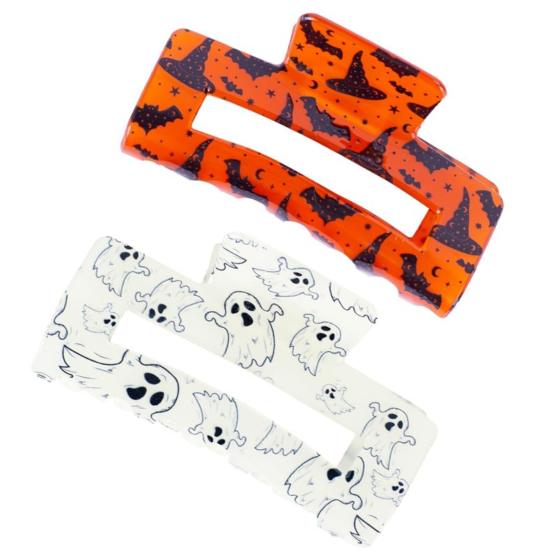 This Halloween hair claw set features two festive designs—one with glow-in-the-dark ghost patterns and the other adorned with playful black bat motifs.