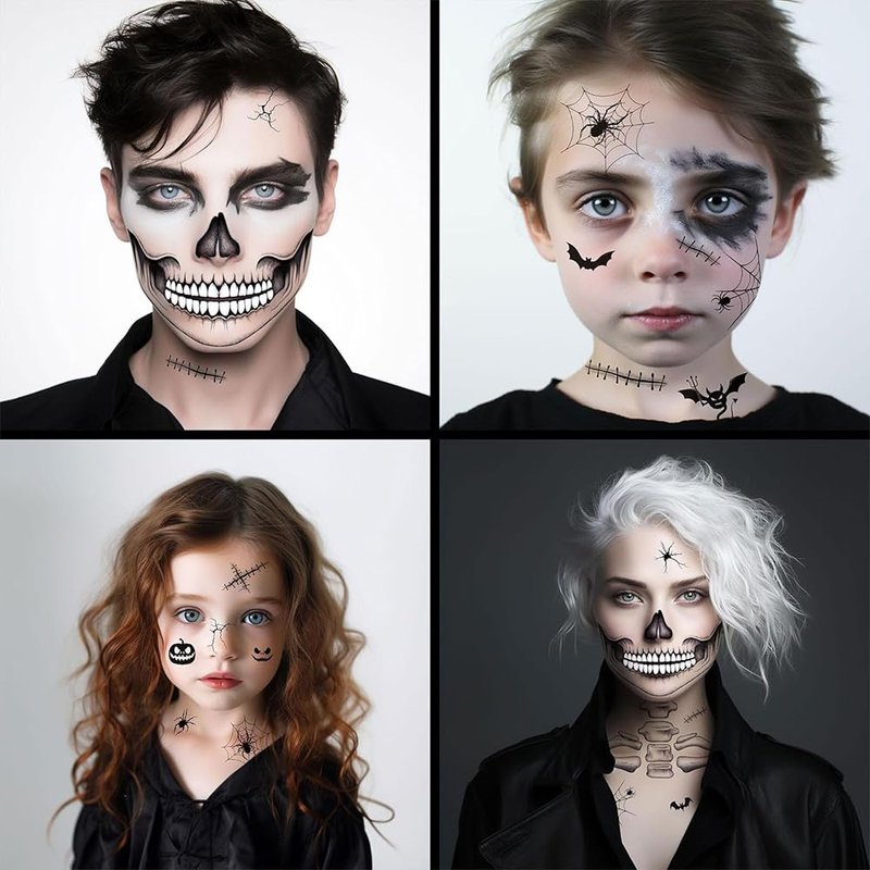 - 【Horror-Themed Versatility】: Zombie makeup kit for kids adults vampire Halloween Temporary Tattoos. Chucky makeup face fake stitches scratches skull bat witch spiderweb spider web horror scar scary blood wound temporary tattoos.