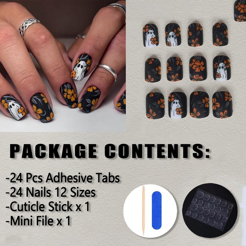 - Nail Art Decoration: 24 Pcs Halloween short false nails, 24 pieces of jelly glue, 1 mini nail file, 1 wooden stick. White ghost fake nails can get your favorite manicure in just 5 minutes without waiting at the nail salon