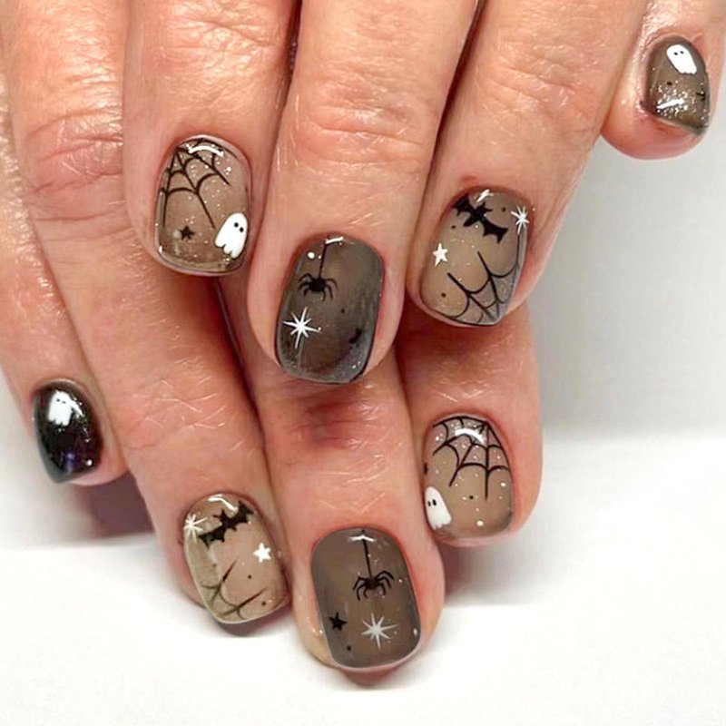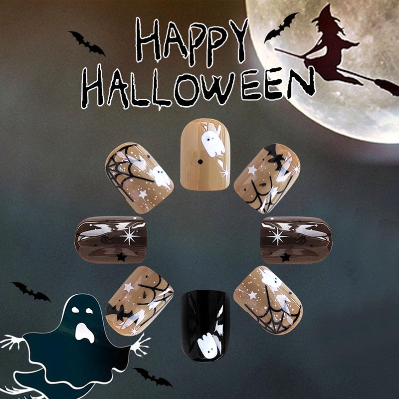 Halloween Press on Nails Short Square Fake Nails Press ons Brown Full Cover Glue on Nails Spider Web Bat Ghost Design False Nails Glossy Artificial Stick on Nails for Women 24Pcs
