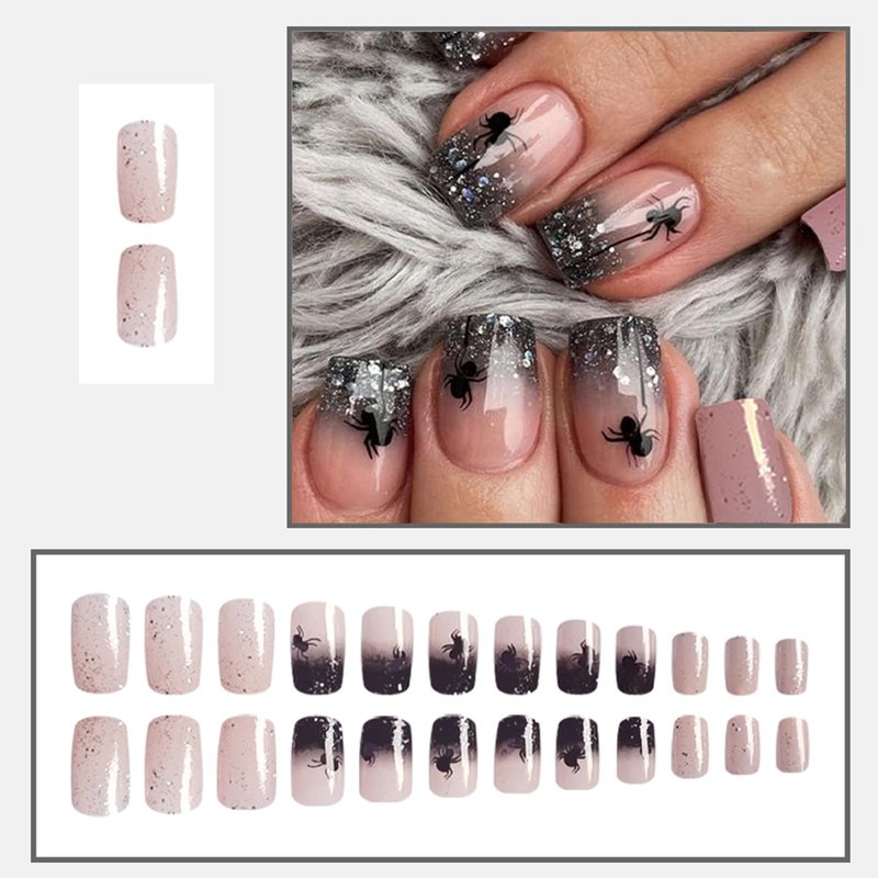 Halloween Press on Nails Short Square Fake Nails with Spider Designs Black Silver Glitter French Tips False Nails Pink Full Cover Glossy Artificial Acrylic Nails Glue on Nails for Women Girls 24Pcs