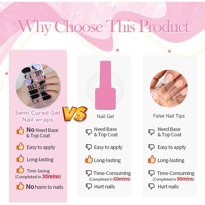 - Healthy Nails- UV cured nail stickers do not need to polish the surface of nails when applying, only need to clean surface of nails. No damage to nail layer.