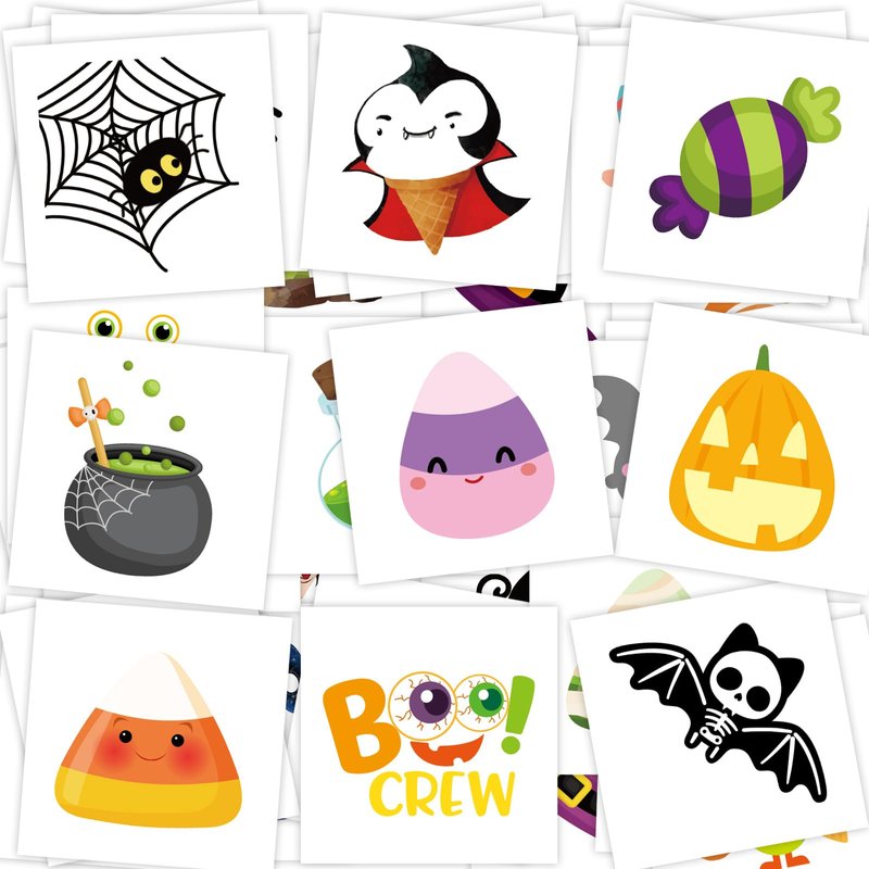 - 72 Cute Designs: Halloween tattoos for kids are colorful and various with Halloween patterns, such as monster; ghost; witch; spider; pumpkin; skeleton; candy and etc; Great choice for Halloween goody bag stuffers