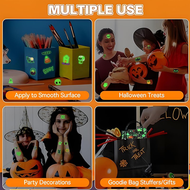 - Halloween Day Temporary Tattoos: Package contain 10 sheets 90 pcs luminous Halloween temporary tattoos with pumpkins, ghosts, spider webs, zombies, skeletons, candy, witches and other favorite patterns. These glow tattoos will make you unique in the crowd.
