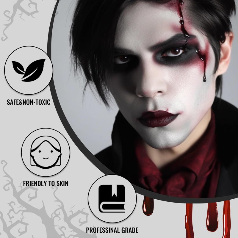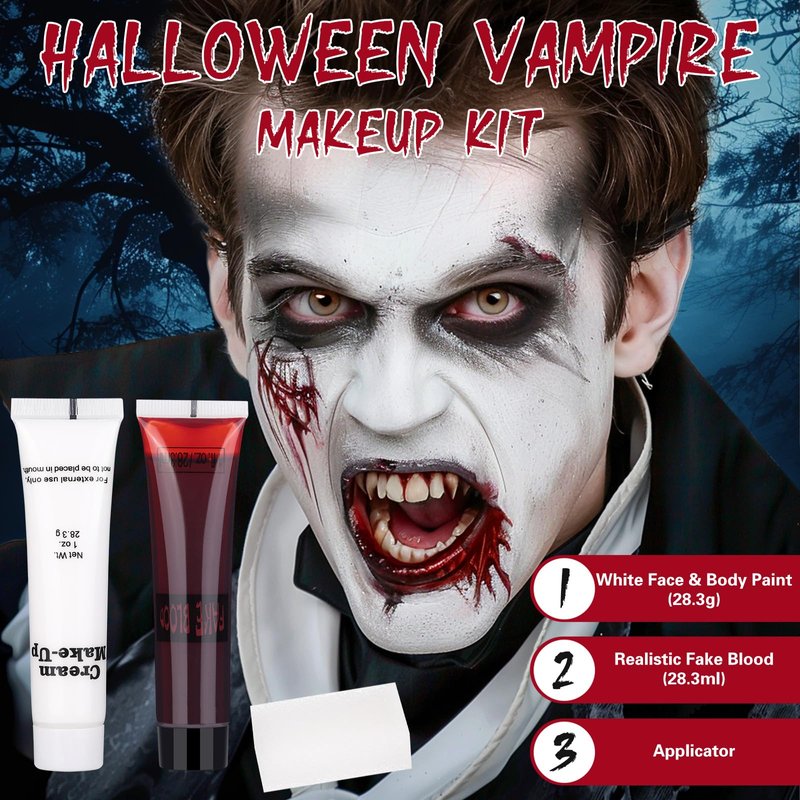 - 【Halloween Vampire Makeup Kit】Includes white face & body paint(28.3g), realistic fake blood(28.3ml) and Applicator, this easy to carry fx makeup kit can satisfy your special effects makeup needs, allowing you to easily create realistic and natural wound special effects.