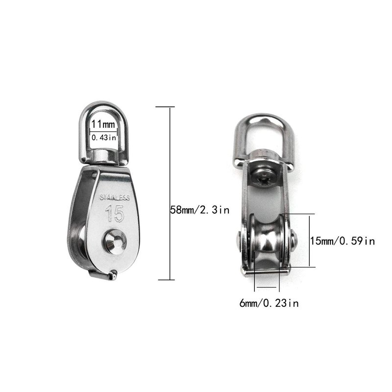 - M15 Single Pulley Block Overall Size: 58 * 21mm / 2.3 * 0.83in (length * width), Max Load: 80 lbs.