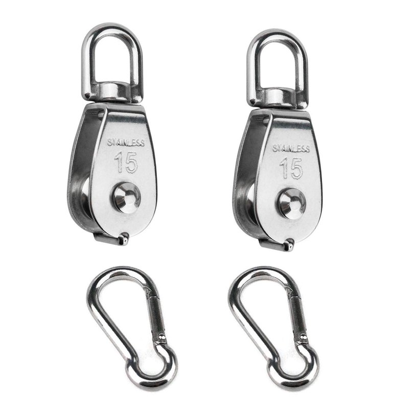 - Packaging includes:2 PCS Stainless Steel Pulley, 2 PCS Stainless Steel Spring Snap Hook