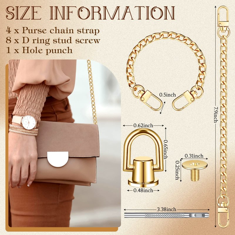 - Complete and Considerate Combination: you will receive 8 pieces of chain purse straps, 16 pieces of leather craft rivets, both in champagne gold, vintage black, elegant silver, and light gold color, together with 1 piece of hole punch, a nice combination to DIY your bags