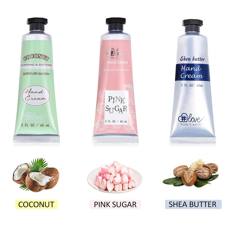 - 3 Beautiful Fragrances : Pink Sugar, Shea Butter and Coconut. Featuring fresh and sweet fragrances, these aromatic smells lift your spirit and bring you energy. These deeply hydrating and moisturizing hand creams make your hands silky-soft