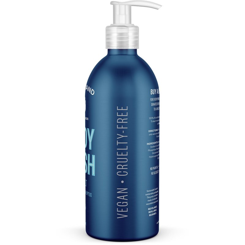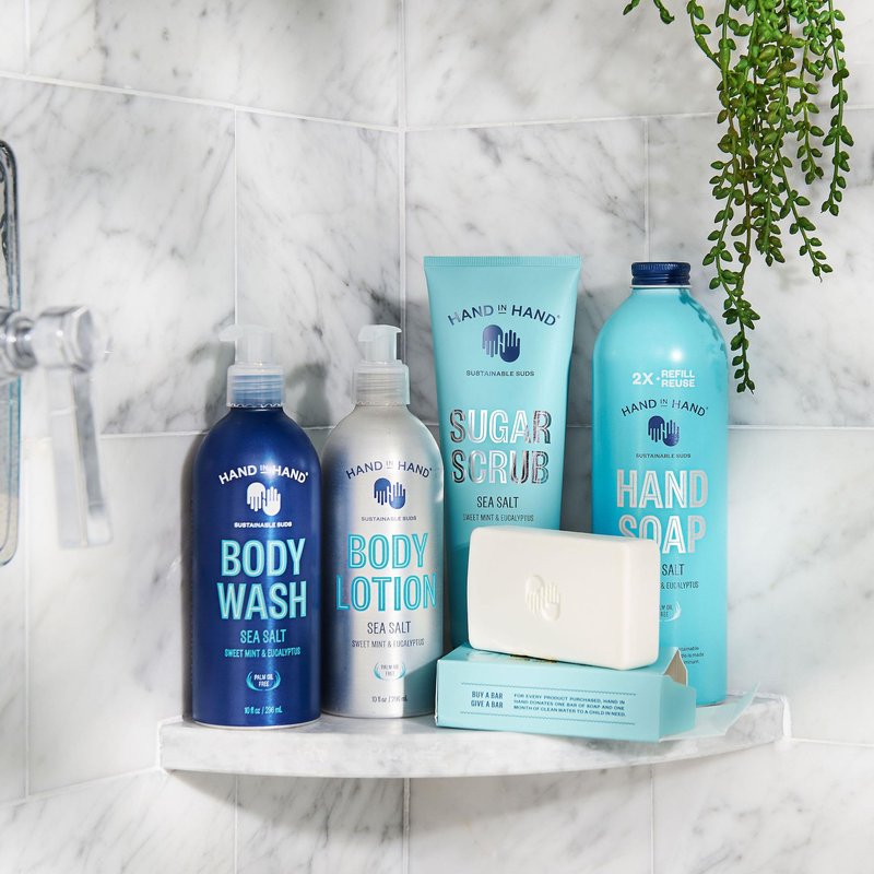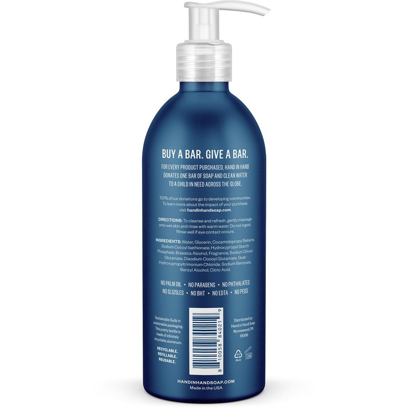 Sweet mint & eucalyptus. Vegan. Sustainable suds. Palm oil free. No palm oil. No parabens. No phthalates. No SLS/SLES. No BHT. No EDTA. No pegs. handinhandsoap.com. Buy a bar. Give a bar. For every product purchased, hand in hand donates one bar of soap and clean water to a child in need across the globe. 100% of our donation go to developing communities. To learn more about the impact of your purchase visit handinhandsoap.com. Sustainable suds in sustainable packaging. This pretty bottle is made of infinitely recyclable aluminum. Infinitely recyclable. Recyclable. Refillable. Reusable. Cruelty-free. Made in the USA.